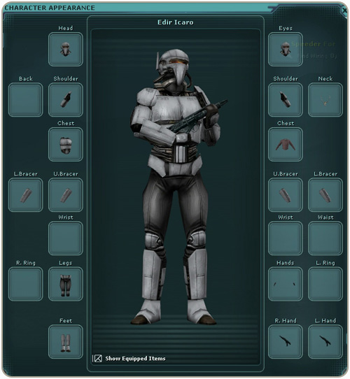 The Appearance feature is very simple and easy to use, but also very powerful. All characters now have an Appearance Inventory. This inventory mimics the normal slots on your character where worn items would go. Just like how your character has a shoulder slot, the Appearance Inventory has a shoulder slot as well.