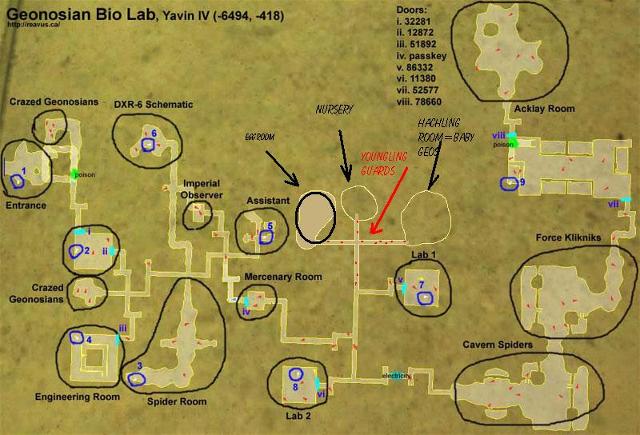 Soon after the Battle of Yavin 4, word spread around the Galaxy about this secret Geonosian biogenics research lab where Geonosian scientists were experimenting on creatures and mutating them for use in the Geonosian execution arena. Other, more disturbing creations such as mutated Klikniks and Kwi's were being created as well. This was a well-hidden base in Yavin 4's immense jungle, where the location has been verified.
