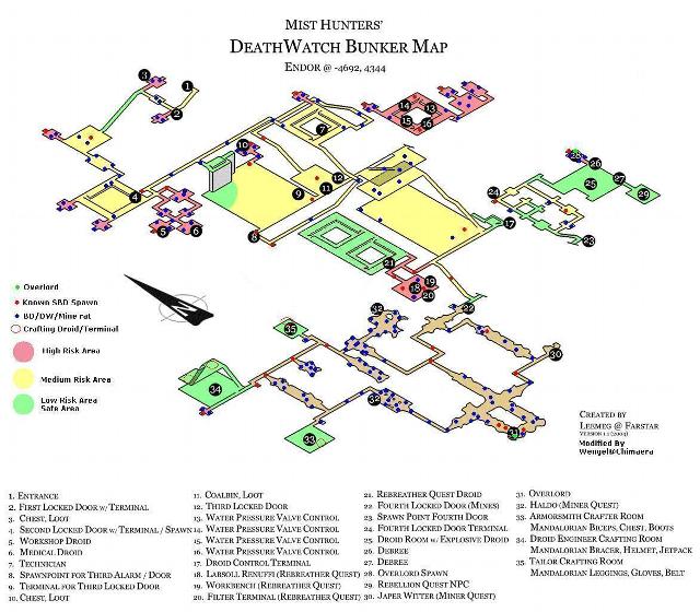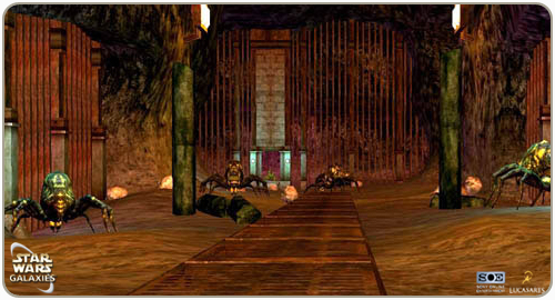 Adventurers who dare to travel to the Outer Rim, cavort with criminals and manage to sneak into this most deadliest of places will face Black Sun Assassins, Mercenaries, guards, henchmen, super battle droids, battle droids, droidekas, and blastromechs. Throughout the lower levels of the bunker, players will face the Death Watch blood guard, wraiths, and the hardiest may even encounter the Death Watch themselves!