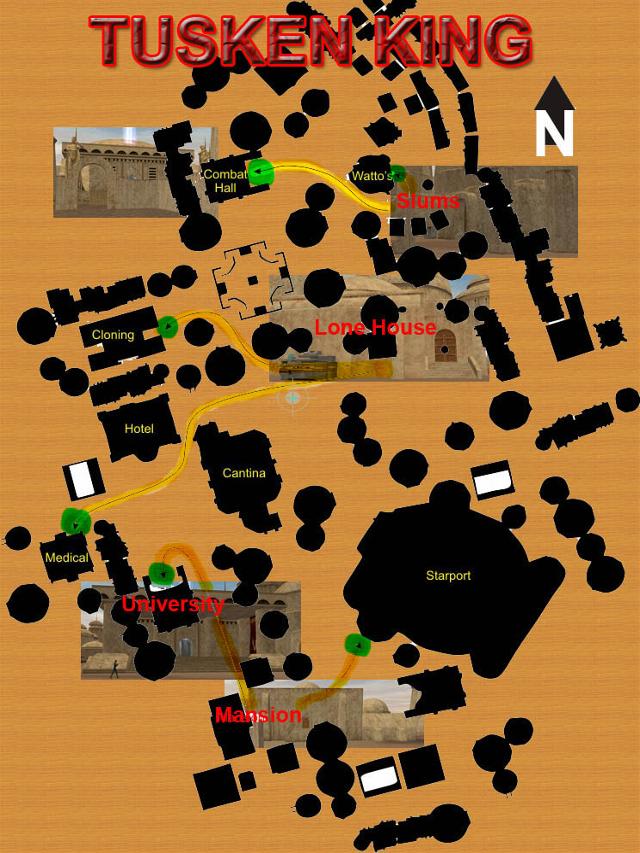 | Phase 1: Liberating the City Head straight to the cantina and kill all Tuskens there. Kav Goldor "GOLD" will come inside the cantina. After liberating the cantina, 2 members stay there, the others go liberate the city in this order: - Liberate the University - Liberate the Medical Centre - Liberate the Hotel - Liberate the Cloning Facility - Liberate the Combat Hall - Liberate Watto's Shop - Liberate the Starport Group goes around and kills every tusken in each building until that building dissapears from the liberating list. They usually involve 1-2 gold elites protected by a few silver elites and alot of normal tuskens. |