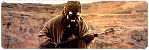 Sand People endure in the desert by shielding themselves from the wrath of the binary suns and the deadly heat. Heavy, dusty bandages and cloth protect their faces, and metallic eye protection lenses allow them to see in even in fierce sandstorms. A breath filter over the nose and mouth also give some protection from sand particles. A moisture trap is attached to the filter to provide some necessary hydration in the scorched air.