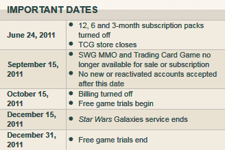 We write to you today to inform you that on December 15, 2011, Sony Online Entertainment (SOE) and LucasArts will end all services (MMO and Trading Card Game) for Star Wars Galaxies (SWG). The shutdown of SWG is a very difficult decision, but SOE and LucasArts have mutually agreed that the end of 2011 is the appropriate time to end the game. We are extremely grateful to all of the SWG fans. We have had the rare opportunity to host one of the most dedicated and passionate online gaming communities and we truly appreciate the support we've received from each and every one of you over the course of the past eight years. In recognition of your incredible loyalty, we are extending special Fan Appreciation offers to the current SWG community. We also plan to go out with a bang with a galaxy-ending in-game event in December and hope to see you all there. The details relating to these offers and events as well as the timeline and specifics regarding the discontinuation of the service, are provided below. Again, we want to extend our heartfelt thanks to our player community for making SWG one of the best online communities in gaming history.